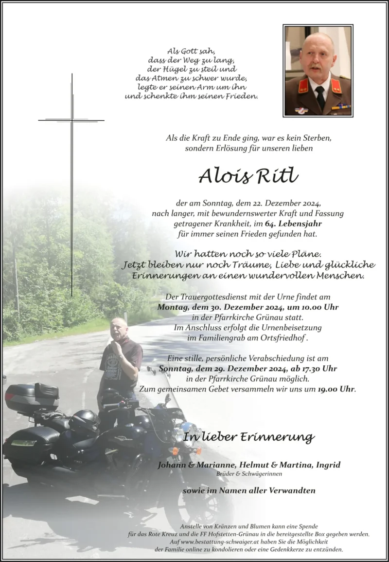 Fam. Evelyne & Gerhard GerstlLieber Alois,danke für deine Kameradschaft!Ein Licht auf deinen Weg🕯Ruhe sanft!23. Dezember 2024