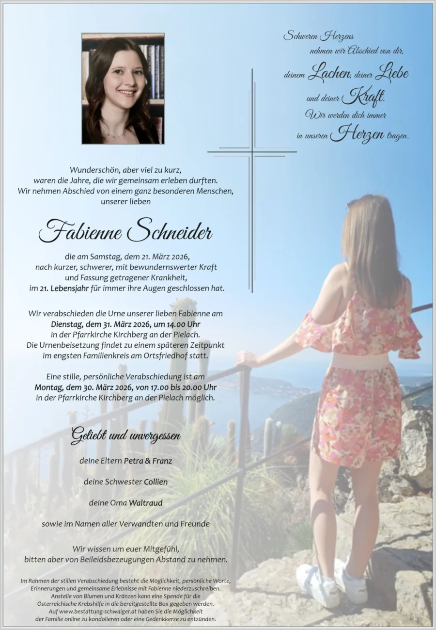 Christa WochnerAufrichtige Anteilnahme und viel Kraft der Familie! Ruhe in Frieden, Fabienne23. März 2026