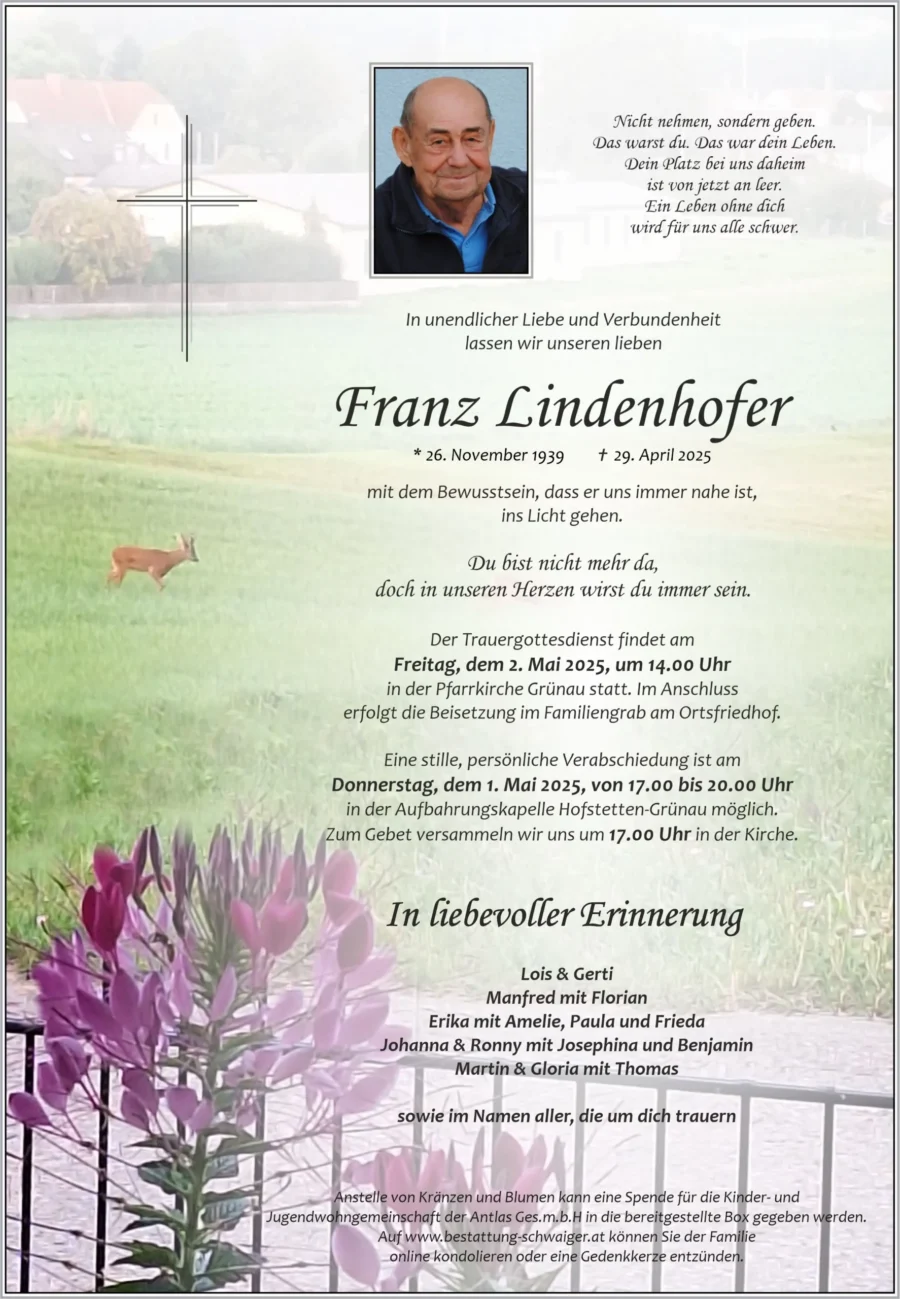 Fam. Josef & Andrea, Walburga FuchsRuhe in Frieden Herr Lindenhofer!30. April 2025