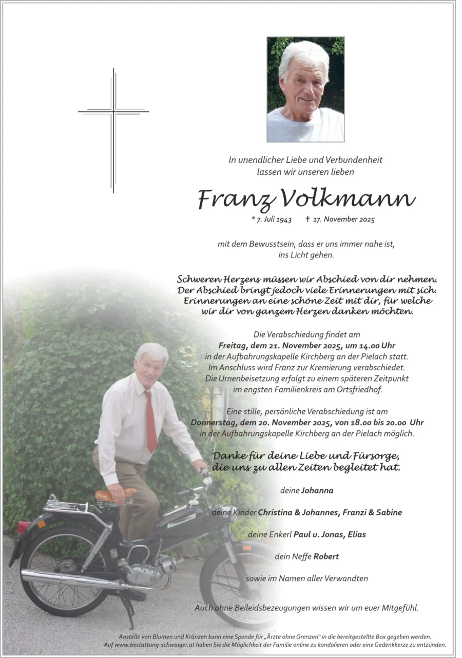 Maria und Peter, Waldweg 2Lieber Franz, ruhe in Frieden. Wir trauern mit deiner Familie.21. November 2025