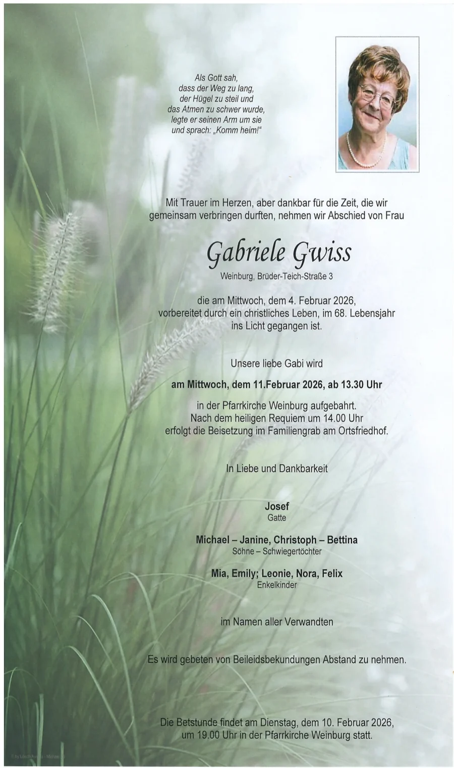Fam. Robert und Anna TrimmelRuhe in Frieden Gabi,viel Kraft der ganzen Familie. Aufrichtige Anteilnahme6. Februar 2026