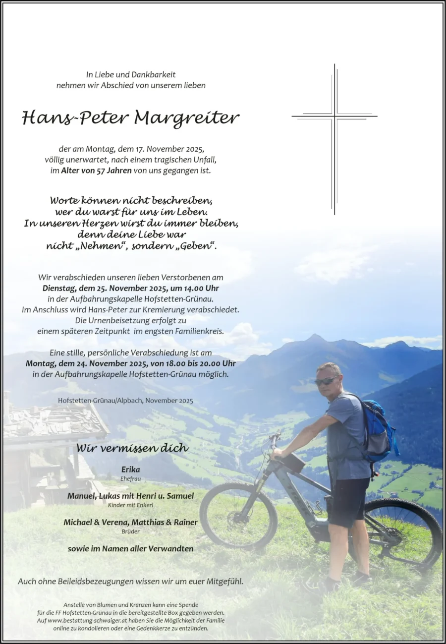 Leopold FuchssteinerRuhe in Frieden lieber Hans-Peter.Herzliches Beileid der Trauerfamilie.Onkel Leo19. November 2025
