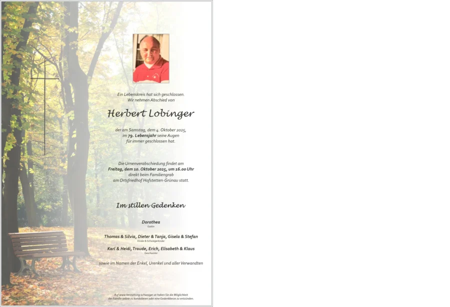 Fam.PoschEin Licht für die letzte Reise Ruhe in Frieden!Aufrichtige Anteilnahme!13. Oktober 2025Rudi SteinerAufrichtige Anteilname - ruhe in Frieden!10. Oktober 2025Monika KalteisRuhe in Frieden und herzliche Anteilnahme der Familie!10. Oktober 2025Karl & Barbara GruberR.I.P. Aufrichtige Anteilnahme.9. Oktober 2025Familie Herbert und Monika HollausHerbert, ruhe in Frieden!9. Oktober 2025Rosemarie MikschAufrichtige Anteilnahme!9. Oktober 2025Pensionistenverband Hofstetten-GrünauDanke für Deine Mitgliedschaft im Pensionistenverband, ruhe in Frieden.9. Oktober 2025Siegfried GrubnerRuhe in Frieden!9. Oktober 2025Fam. Ingeborg und Josef HerzogUnsere aufrichtige Anteilnahme der Trauerfamilie.9. Oktober 2025Maria GrünsteidlAufrichtige Anteilnahme9. Oktober 2025Anneliese KögelEin Licht auf deine letzte Reise. Ruhe in Frieden.9. Oktober 2025Johann & Franziska GruberAufrichtige Anteilnahme den Trauerfamilien9. Oktober 2025Karl und Herta NeidlRuhe in Frieden9. Oktober 2025Karl und HeidiR.i.P. Herbert! Wir wünschen dir, dass du deinen Frieden gefunden hast.8. Oktober 2025Helga KrückelRuhe in Frieden8. Oktober 2025Heinz und Maria GuselAufrichtiges Beileid den Trauerfamilien8. Oktober 2025Andreas &Elisabeth SchweigerRuhe in Frieden8. Oktober 2025Rotheneder Hans / WiesenfeldEin letztes Pfiat Gott , dein Lehrbub vom Pirklzeit ,.. Hans'l8. Oktober 2025Christa SchmirlAufrichtige Anteilnahme8. Oktober 2025Manuela Nadja & Herbert PawlitschkoAufrichtige Anteilnahme. Ruhe in Frieden.8. Oktober 2025Wolfgang und Karin TonnerRuhe in Frieden7. Oktober 2025Barbara SaupriglLetzte Grüße. Ruhe in Frieden.7. Oktober 2025Ruhe in FriedenEin Licht für deine letzte Reise7. Oktober 2025ClaudiaEin Licht für deine letzte Reise 🕯️ Ruhe in Frieden.7. Oktober 2025Grumbäck GabiRuhe in Frieden! 🖤7. Oktober 2025Franz GronisterAufrichtige Anteilnahme Franz und Eva Gronister7. Oktober 2025Wagner Rosa und Praschl ChristaUnser aufrichtiges Beileid7. Oktober 2025Eine HelferunIn liebevoller Erinnerung 🌷7. Oktober 2025Jan und PeterRuhe in Frieden Schwager!7. Oktober 2025Traudi und Roman AfflenzerAufrichtige Anteilnahme!7. Oktober 2025Familie karl RitlLetzte Grüße, ein Licht für deinen Weg und viel Kraft den Hinterbliebenen.7. Oktober 2025Fritz & Regina GravoglAufrichtige Anteilnahme!7. Oktober 2025Ingrid PrucknerRuhe in Frieden7. Oktober 2025MarioRuhe in Frieden!7. Oktober 2025Toni und Susi WieserRuhe in Frieden. Aufrichtige Anteilnahme den Trauerfamilien.6. Oktober 2025JasminRuhe in Frieden!6. Oktober 2025Maria & Herbert GruberIn lieber Erinnerung! Ruhe in Frieden!6. Oktober 2025Fam. Raninger ErichAufrichtiges Beileid!6. Oktober 2025Karl HollausRuhe in Frieden!6. Oktober 2025Familie Manfred und Karina SchmirlAufrichtige Anteilnahme6. Oktober 2025Schuster Franz und MonikaAufrichtige Anteilnahme 6. Oktober 20256. Oktober 2025DorliRuhe in Frieden6. Oktober 2025Karner ElfriedeMein Aufrichtiges Beileid . Ruhe in Frieden .6. Oktober 2025Bernadette und Alexander LangAufrichtige Anteilnahme, viel Kraft in dieser schmerzvollen Zeit.6. Oktober 2025Fam. Peter SchuhmeierAufrichtige Anteilnahme6. Oktober 2025Leopold FuchssteinerHerzliche Anteilnahme der Trauerfamilie. Ruhe in Frieden.6. Oktober 2025Sissy Sunk- BrandnerAufrichtige Anteilnahme der Familie!6. Oktober 2025SandraRuhe in Frieden6. Oktober 2025Barbara u. Josef OberleitnerAufrichtige Anteilnahme. Ruhe in Frieden.6. Oktober 2025ASBÖ RabensteinAufrichtige Anteilnahme6. Oktober 2025Schuster Erika und ManfredAufrichtige Anteilnahme6. Oktober 2025Markus und Michaela MalousekAufrichtige Anteilnahme6. Oktober 2025Christa WeitgasserMein tiefstes Beileid6. Oktober 2025Fam Sutter Poldi uHahn StefanAufrichtige Anteilnahme Ruhe in Frieden der Familie viel Kraft6. Oktober 2025Margit und Rudi WimmerHerzliche Anteilnahme der Trauerfamilie!6. Oktober 2025Josef und Erni GruberAufrichitge Anteilnahme der Trauerfamilie. Ruhe in Frieden6. Oktober 2025Eva und WolfgangRuhe in Frieden!6. Oktober 2025Thomas, Barbara und KinderRuhe in Frieden6. Oktober 2025Karl&Stefanie DonnerEin Licht für deine letzte Reise.Aufrichtige Anteilnahme6. Oktober 2025Anton und Sissi GroißAufrichige Anteilnajme!6. Oktober 2025Monika & Franz LechnerAufrichtige Anteilnahme!Ruhe sanft!6. Oktober 2025Margit und Karl GrubnerRuhe in Frieden! Aufrichtige Anteilnahme der Trauerfamilie.6. Oktober 2025Margit und Karl GrubnerRuhe in Frieden. Aufrichtige Anteilnahme der Trauerfamilie.6. Oktober 2025Veronika und Herbert WittmannAufrichtige Anteilnahme!6. Oktober 2025Gabriele KarnerEin Licht für deine letzte Reise. Ruhe in Frieden6. Oktober 2025Judith u. Ewald WagnerHerzliches Beileid der Trauerfamilie6. Oktober 2025Karin GrubnerHerzliche Anteilnahme!6. Oktober 2025Familie StanzigAufrichtige Anteilnahme zu Ihrem schweren Verlust!6. Oktober 2025Ruhe in FriedenFamilie Mayerhofer6. Oktober 2025Barbara LugerMein aufrichtiges Beileid6. Oktober 2025Christiana ZöchlingAufrichtige Anteilnahme! Ruhe in Frieden!6. Oktober 2025Sabine & Christian FischerRuhe in Frieden!6. Oktober 2025Herta u. Franz KönigsbergerAufrichtige Anteilnahme Ruhe in Frieden6. Oktober 2025Fink BrigitteRuhe in Frieden!6. Oktober 2025Manuel und LarissaRuhe in Frieden!6. Oktober 2025Irmgard TuschetschlägerAufrichtige Anteilnahme! Ruhe in Frieden!6. Oktober 2025Heidi und Walter LawitzAufrichtige Anteilnahme der Trauerfamilie und ein Licht für deine letzte Reise6. Oktober 2025Elisabeth und KlausLetzte Grüße6. Oktober 2025Manuela Jagsch (Ressl) und Fam.Aufrichtige Anteilnahme der gesamten Trauerfamilie. Ruhe in Frieden.6. Oktober 2025Gabi RinglerRuhe in Frieden. Aufrichtige Anteilnahme der Trauerfamilie.6. Oktober 2025Veronika DomikiewiczMein innigstes Mitgefühl,Ruhe in Frieden6. Oktober 2025TanjaRuhe in Frieden!6. Oktober 2025TraudeRuhe in Frieden6. Oktober 2025TraudeRuhe in Frieden6. Oktober 2025Wolfgang und Angelika FischerRuhe in Frieden6. Oktober 2025Samariterbund RabensteinRuhe in Frieden!6. Oktober 2025Hermi DatzreiterEin Licht für deine letzte Reise