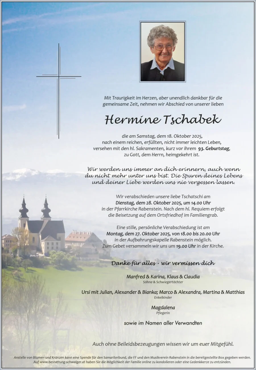 Petra und Harald AigelsreiterRuhe in Frieden liebe Tante Hermi.Wir werden Dich in lieber Erinnerung behalten!19. Oktober 2025