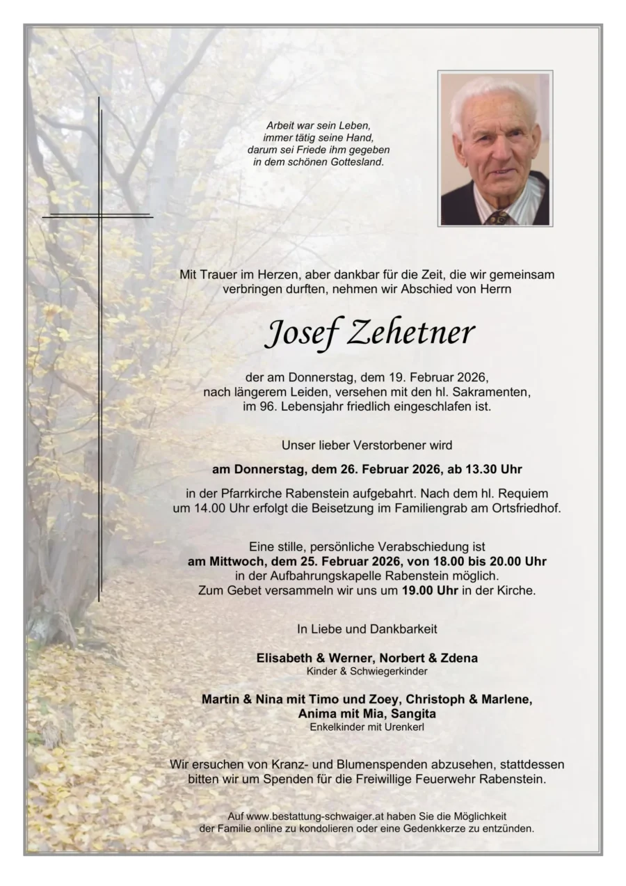 Maria & Herbert GruberRuhe sanft, lieber Herr Zehetner! Aufrichtige Anteilnahme der Trauerfamilie21. Februar 2026