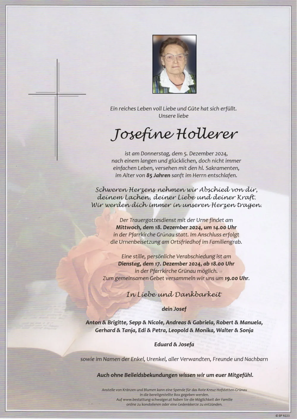 Leopold FuchssteinerRuhe in Frieden, liebe Josefine. Herzliches Beileid der Trauerfamilie.9. Dezember 2024