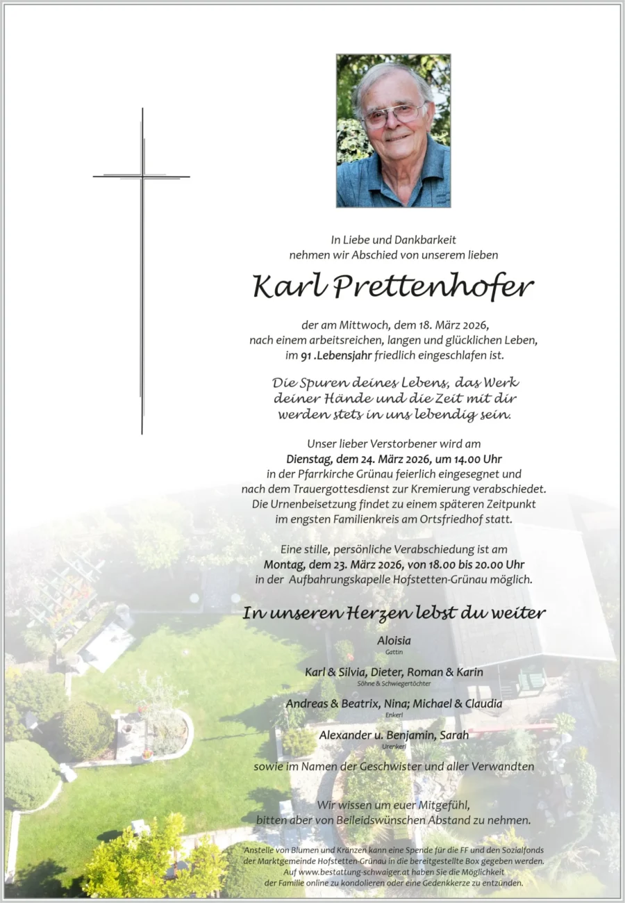 Lois u.Gerti SteinmetzGute Reise Hr.Prettenhofer.Herzliche Anteilnahme den Hinterbliebenen.20. März 2026