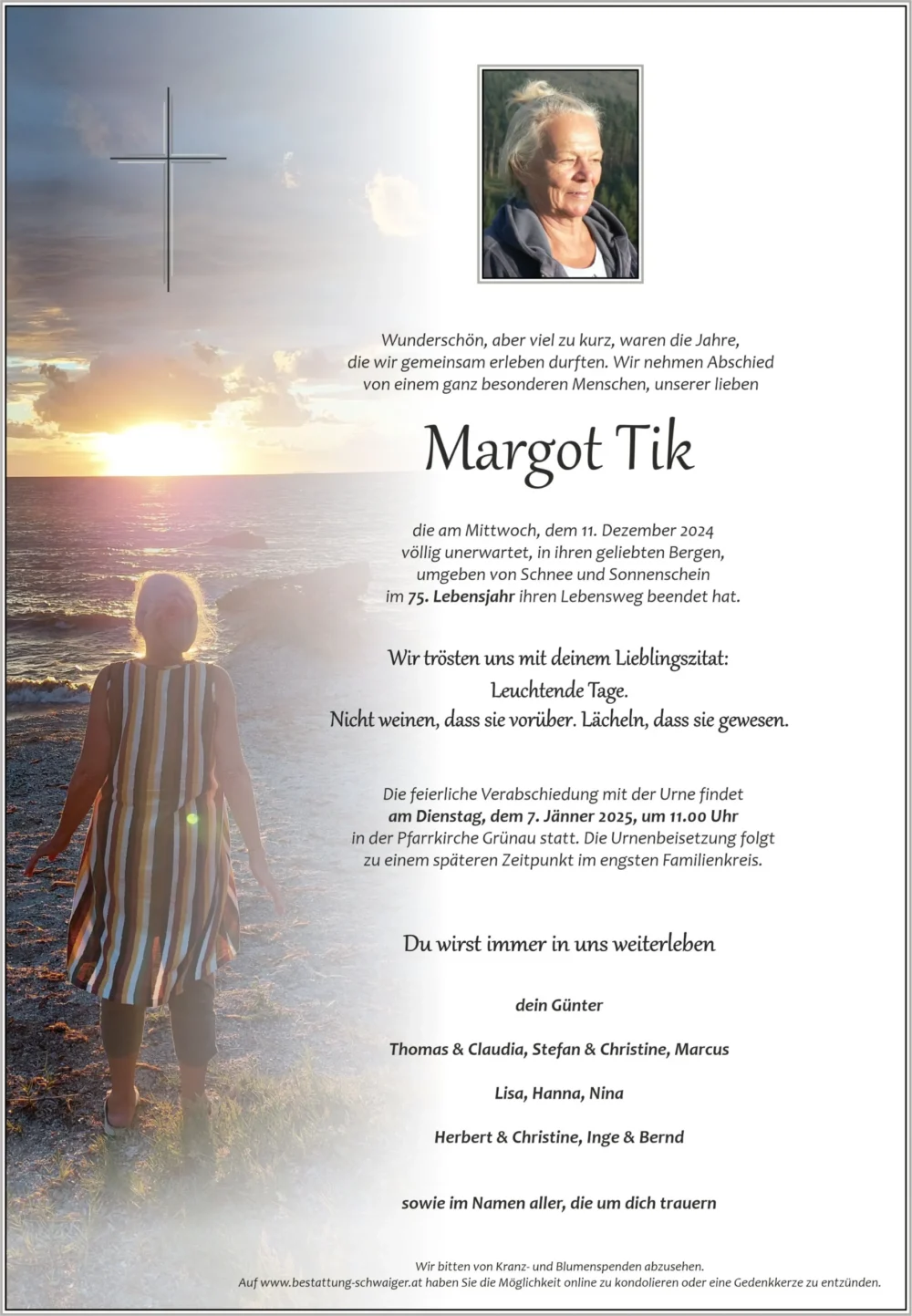 In der Parte zu Margot Tik steht: „Du wirst für immer in uns weiter leben.“ Ja das wird sie tatsächlich indem ich mir jetzt eine Zigarette anrauche und dabei an die liebe Margot denke! Sie war nie eine starke Raucherin aber am Abend nach dem Abendessen gab es meist so ein paar halt davon… Später hat sie sich das Rauchen abgewöhnt aber ich weiß sicher das das nicht wirklich freiwillig war… Somit lebt sie in mir weiter indem ich sicher nicht vorhabe mir meine gemütliche Zigarette ab zu gewöhnen… Mit vielen schönen Grüßen vom Marcus – möge Deine Seele im Himmel weiter existieren!