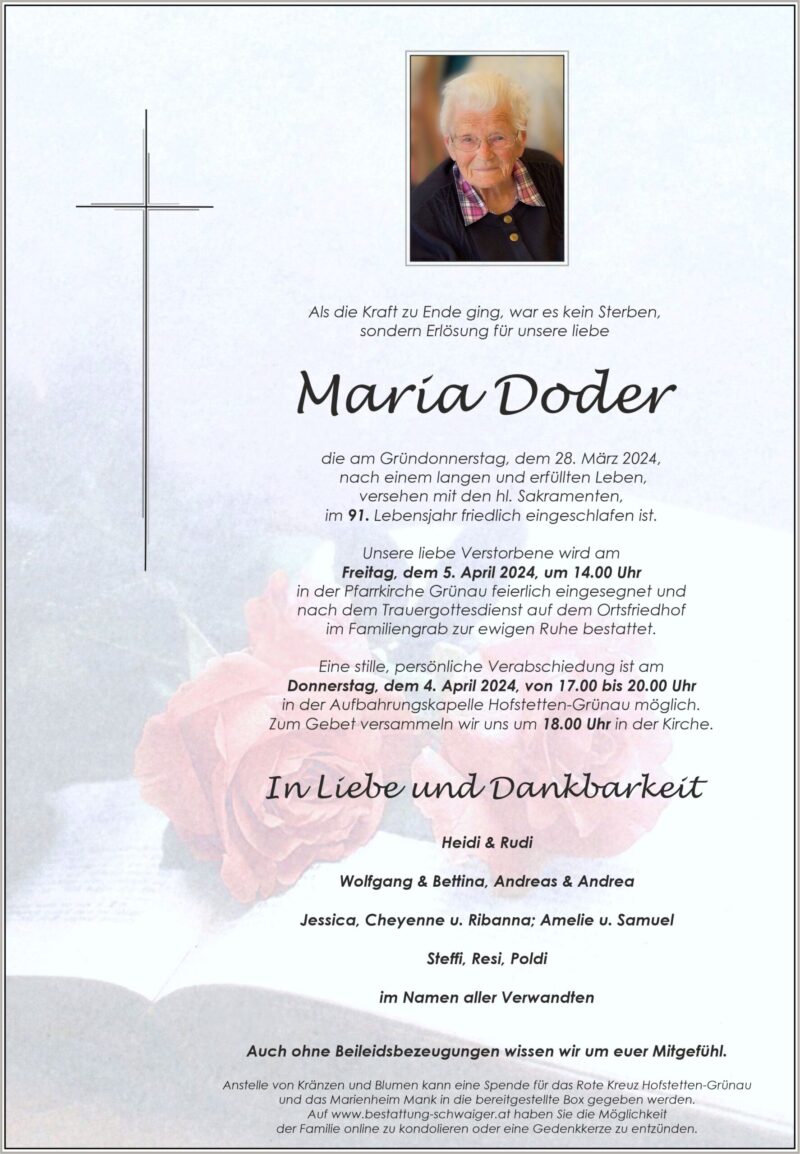 Fam Jutta und Hubert GrünbichlerAufrichtige Anteilnahme. Ruhe in Frieden Frau Doder29. März 2024